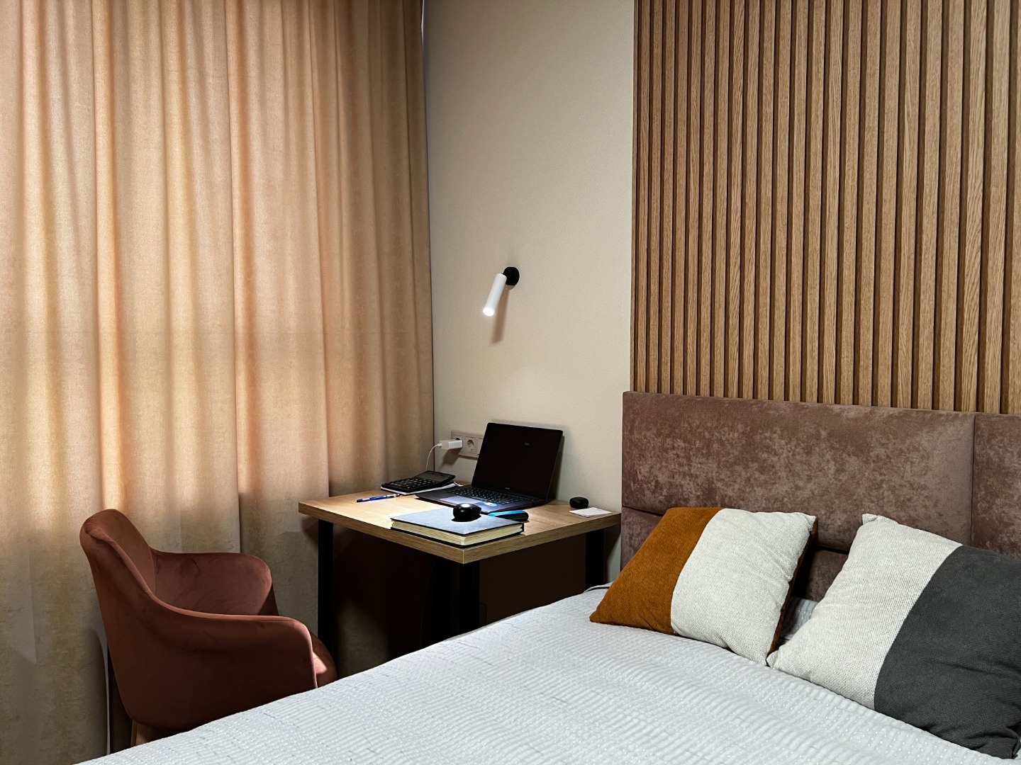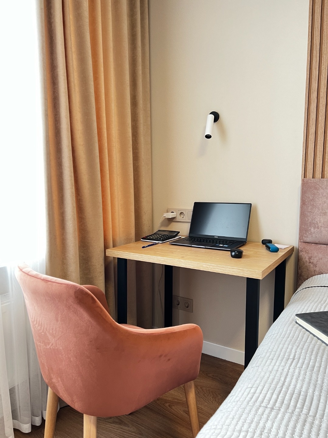 Рабочее место продуманно и организовано правильно с достаточными розетками, светильником, столом, стулом.