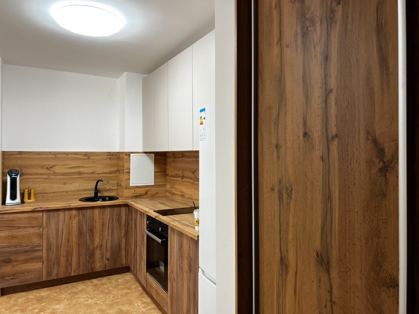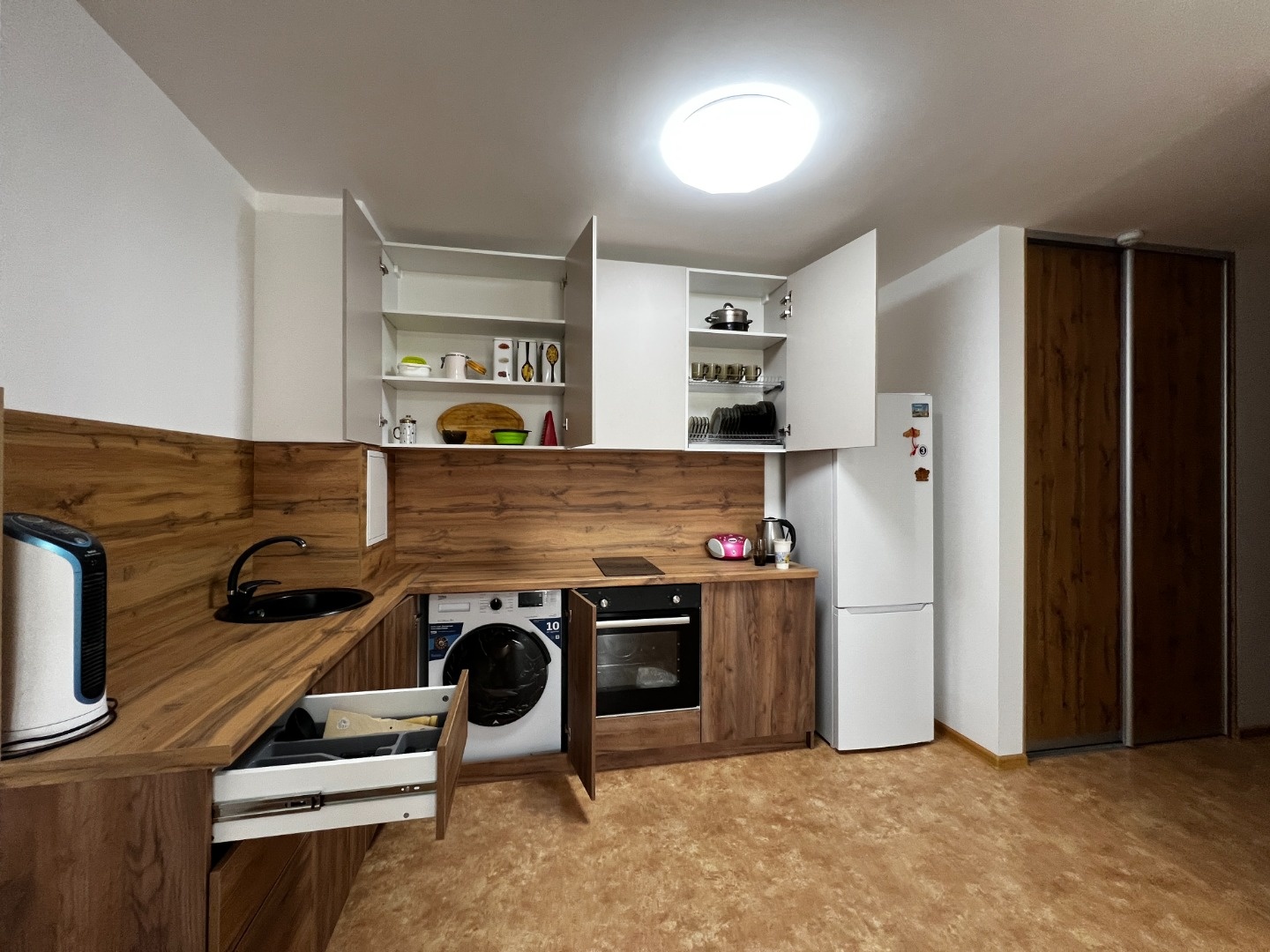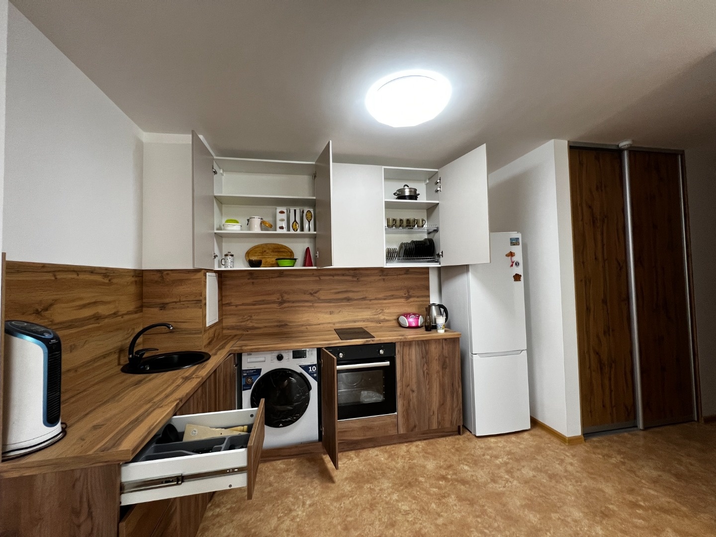 Кухня-гостиная: Кухонный гарнитур удобный, стильный и с местами хранения, холодильник, варочная панель+духовой шкаф, стиральная машина, чайник, стол кухонный, раскладной диван, телефизор.