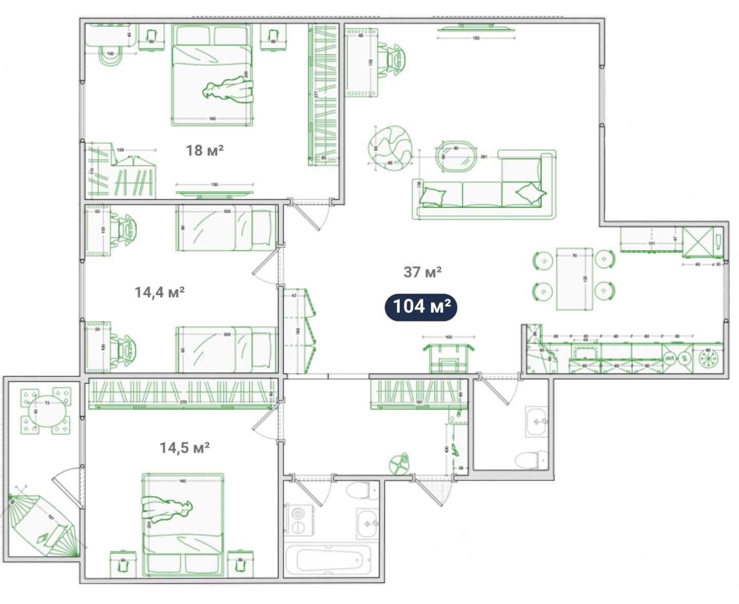 Кухня-гостиная 37 метров, спальни (14+14+18) метров.