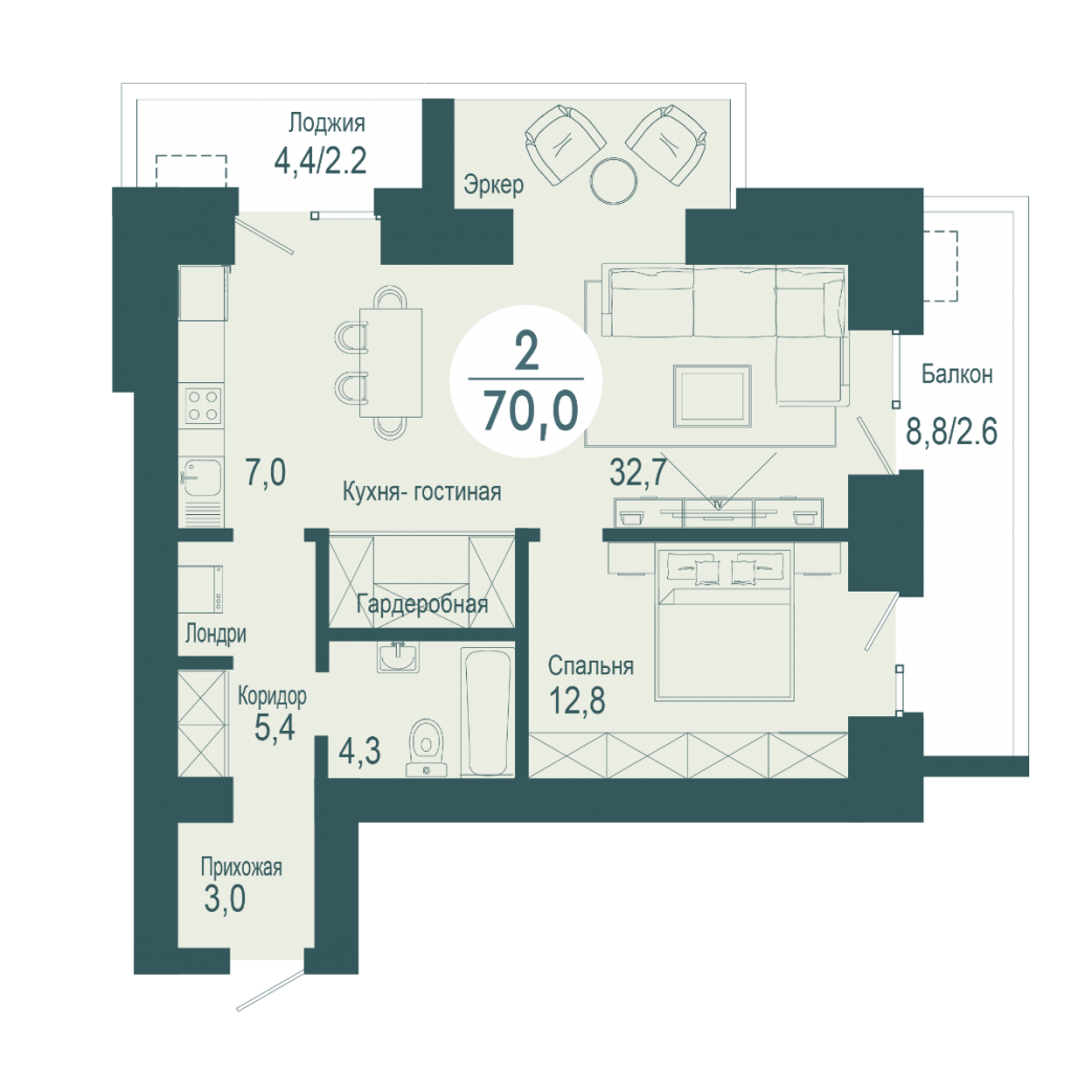 О квартире: изолированнная спальня, кухня-гостиная 32 кв.м., две лоджии, эркер, лондри, гардеробная, ниша для кухни 7 кв.м.