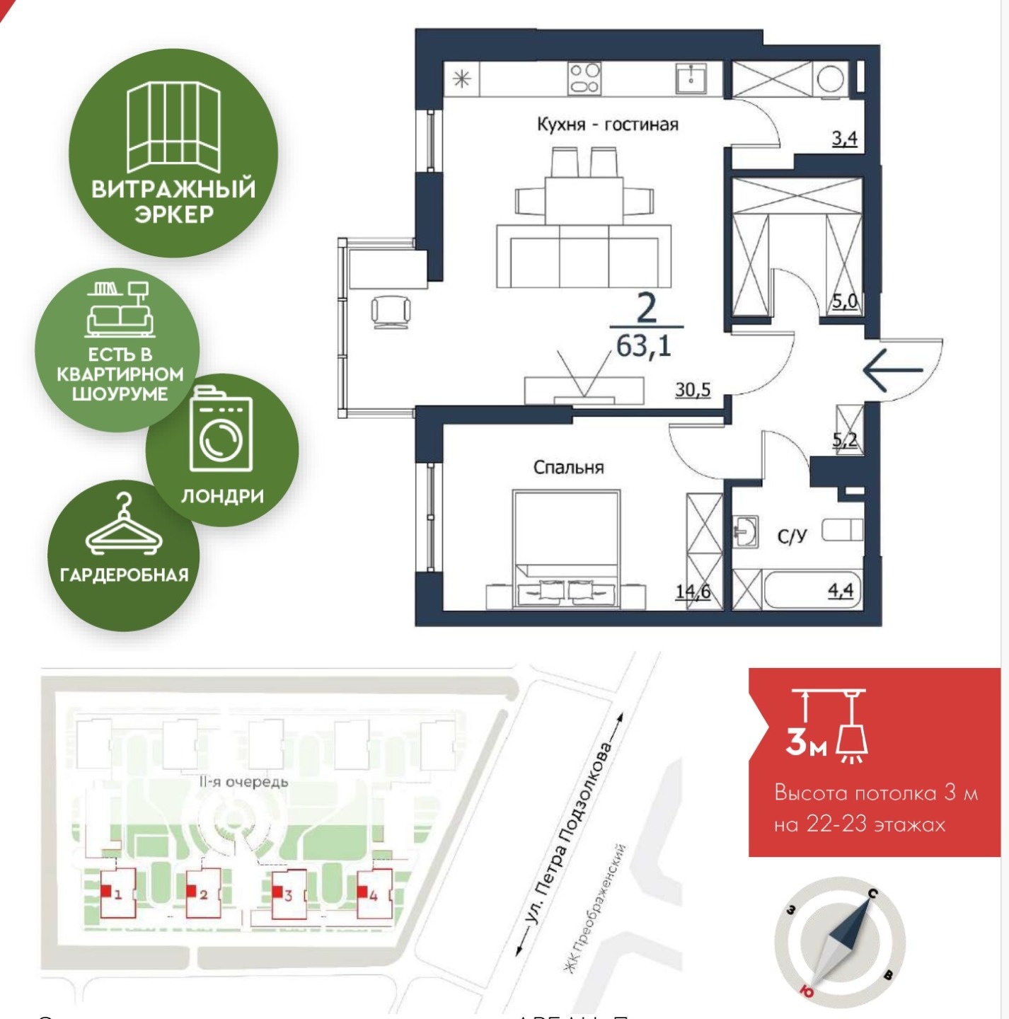 Новый уникальный проект. Панорамные окна с увеличенной площадью остекления, а также интересные угловые окна, из которых открываются виды на город и двор, умные дверные ручки в квартирах, доступ по FACE ID. Досуговый центр ГНЕЗДО с ресторанами и кафе, подземный паркинг, эксплуатируемая кровля, деревянные элементы, входная группа в бревенчатом стиле, игровая комната с горкой и скалодромом, централизованнная система кондиционирования, перголы, променад, разные детские игровые локации.