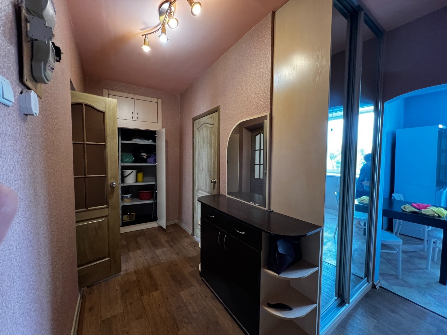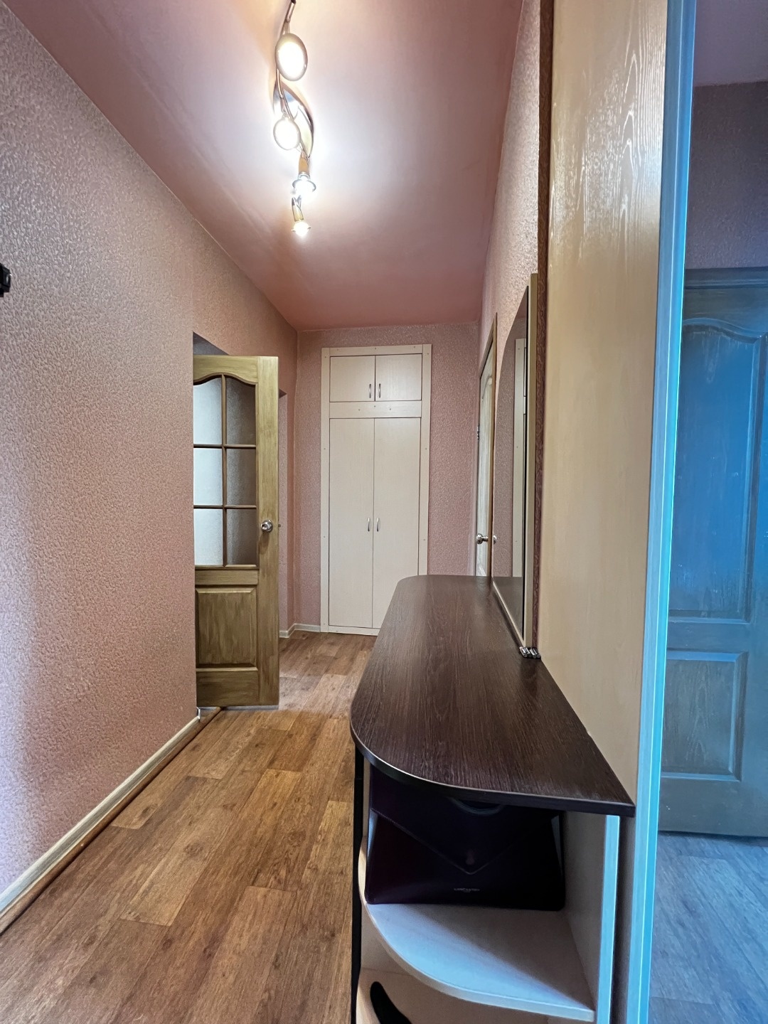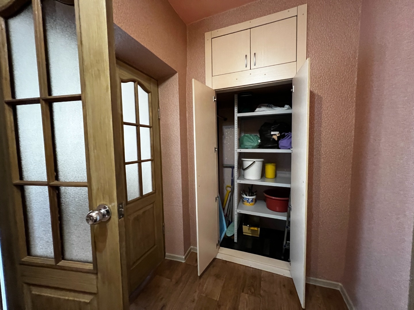 В квартире сделан евроремонт. Заменены трубы, сантехника, установлены радиаторы. Кухонный гарнитур, мебель в коридоре и комнате изготовлены на заказ по индивидуальному проекту — остаются покупателю. Большие пластиковые окна с широкими подоконниками, в обеих комнатах натяжные потолки и ламинат. Современное точечное освещение и люстры. В одной комнате установлен кондиционер. Коридор с кладовкой, куда помещается стеллаж. Две входные двери: одна — из массива дерева, вторая — качественная железная, из толстого металла.