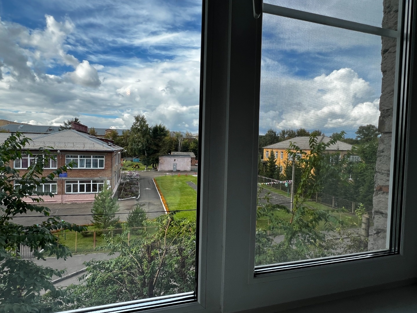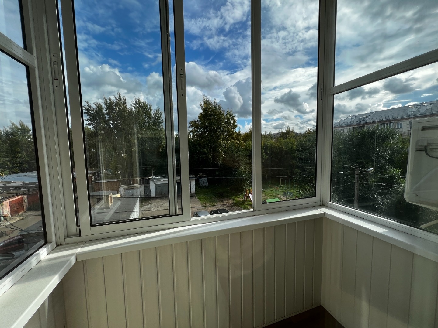 Планировка на две стороны: в большой комнате застеклённый балкон с видом на двор, на кухне и в другой комнате окна выходят на детский сад.