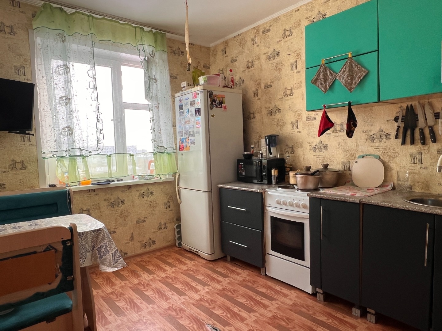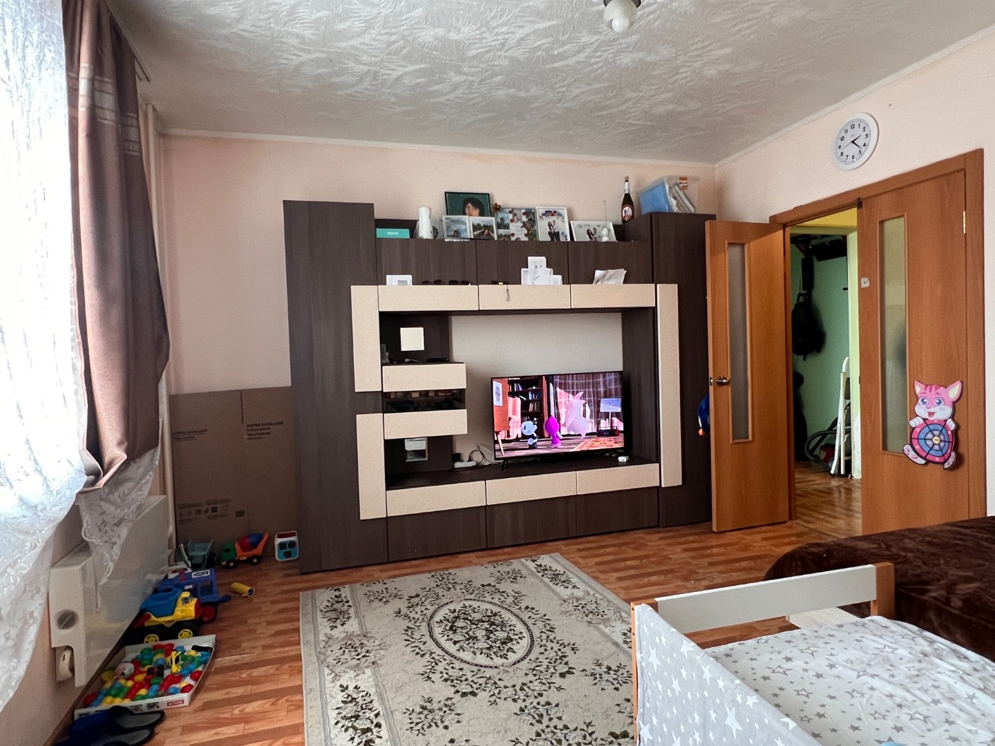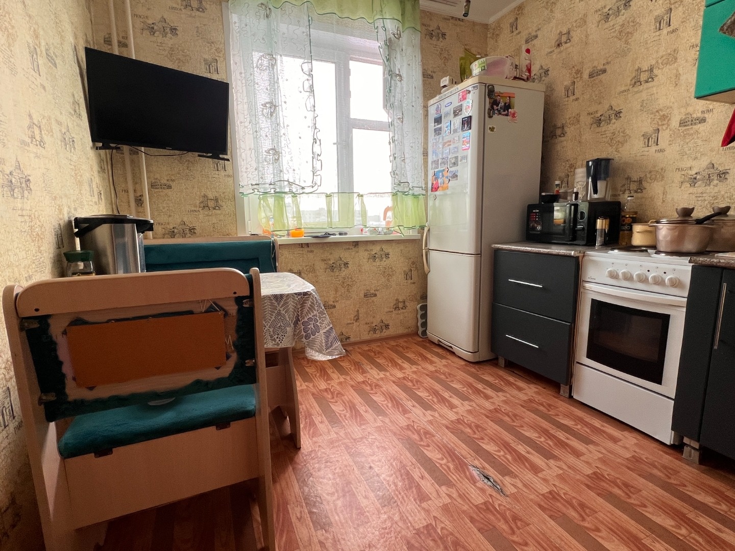 Требуется косметический ремонт, ванна в стеновых панелях, окна пластиковые. Остается кухня без техники, шкаф в прихожей, модульная стенка в зале.