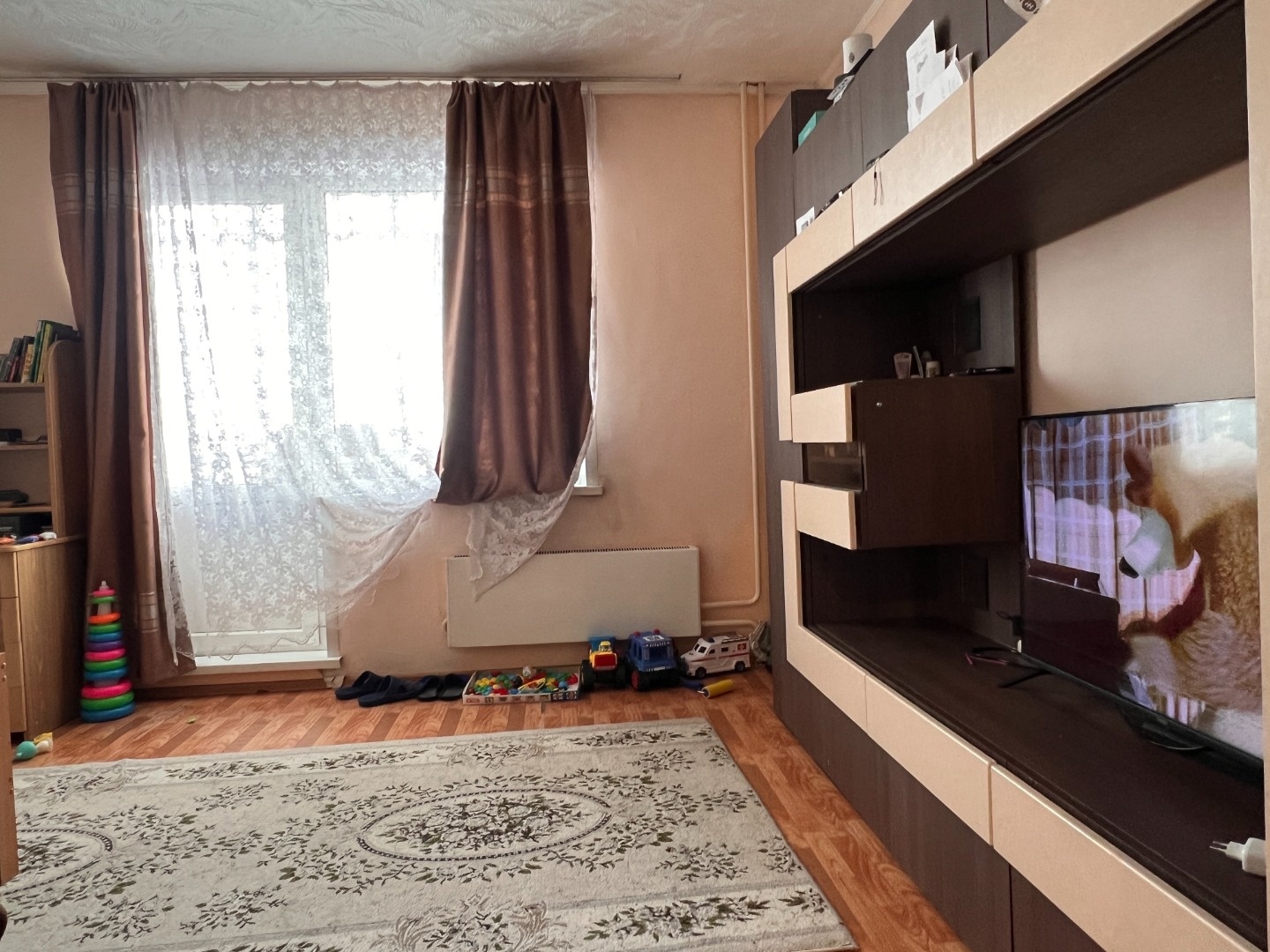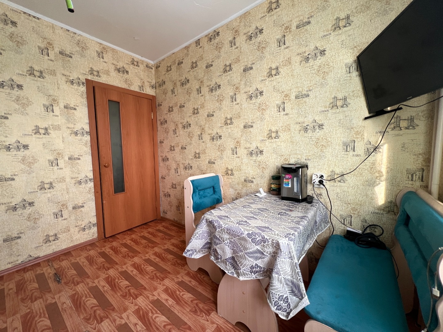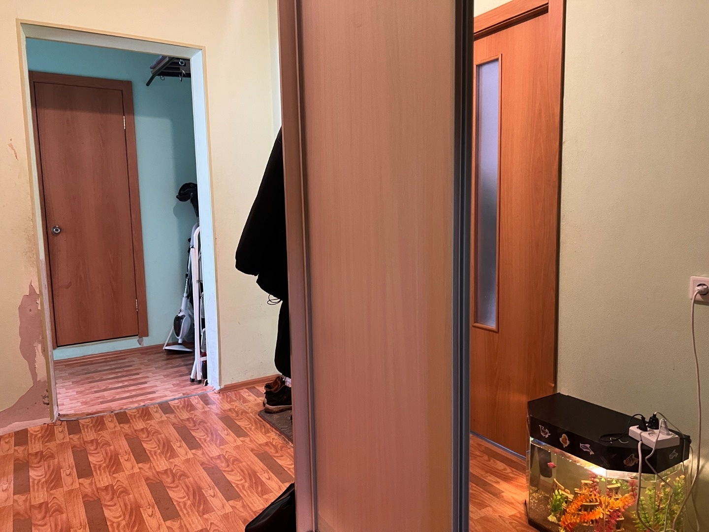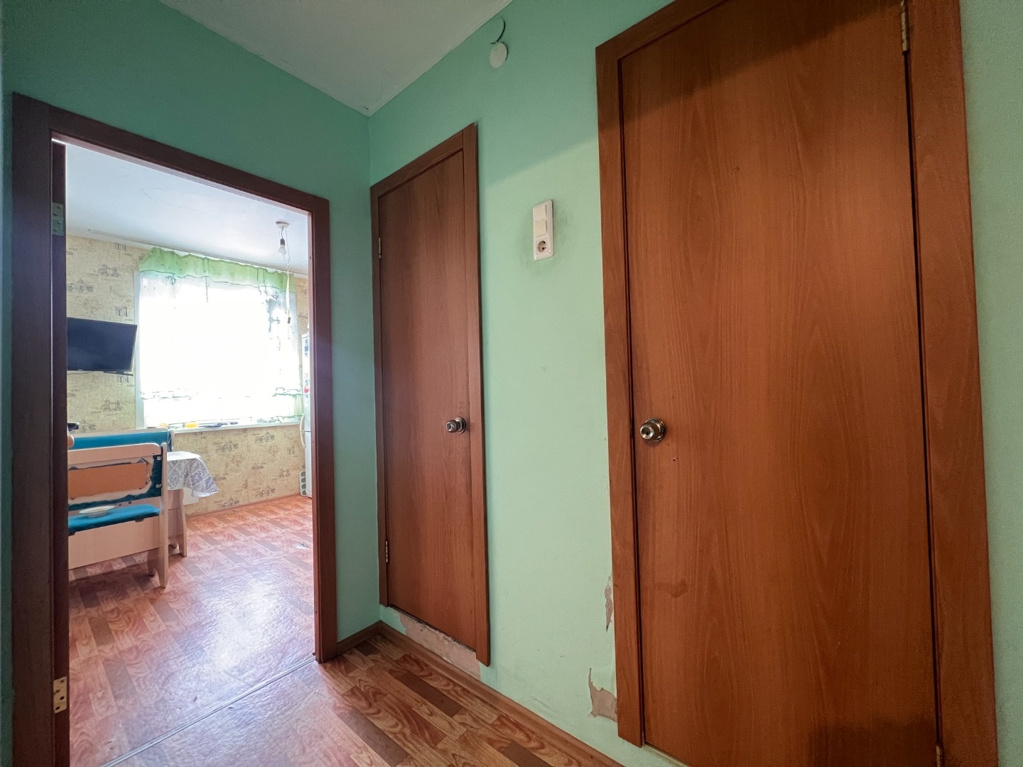 Требуется косметический ремонт, ванна в стеновых панелях, окна пластиковые. Остается кухня без техники, шкаф в прихожей, модульная стенка в зале.